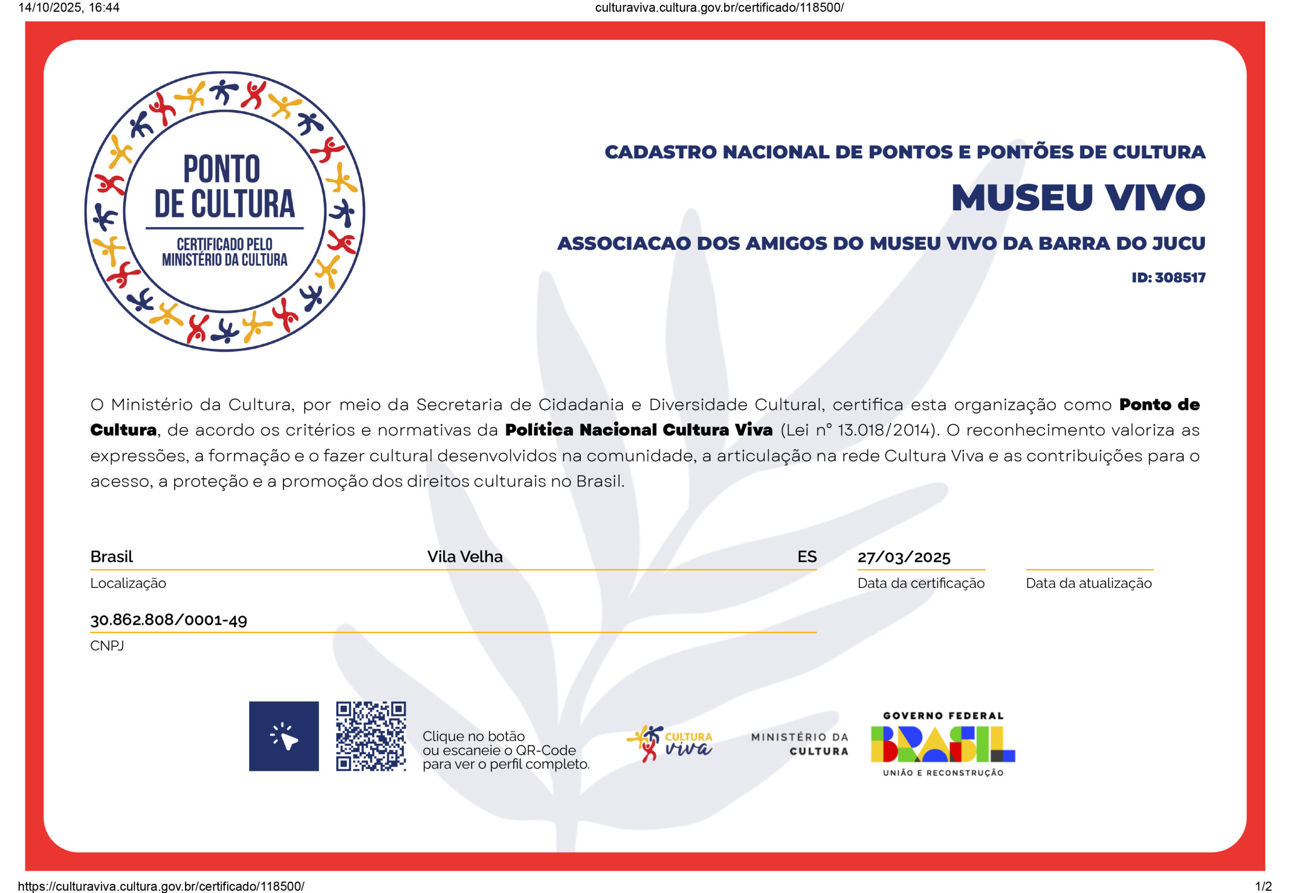 O Museu Vivo da Barra do Jucu recebeu do Ministério da Cultura, o Certificado de Ponto de Cultura, de acordo com os critérios e normativas da Política Nacional Cultura Viva.