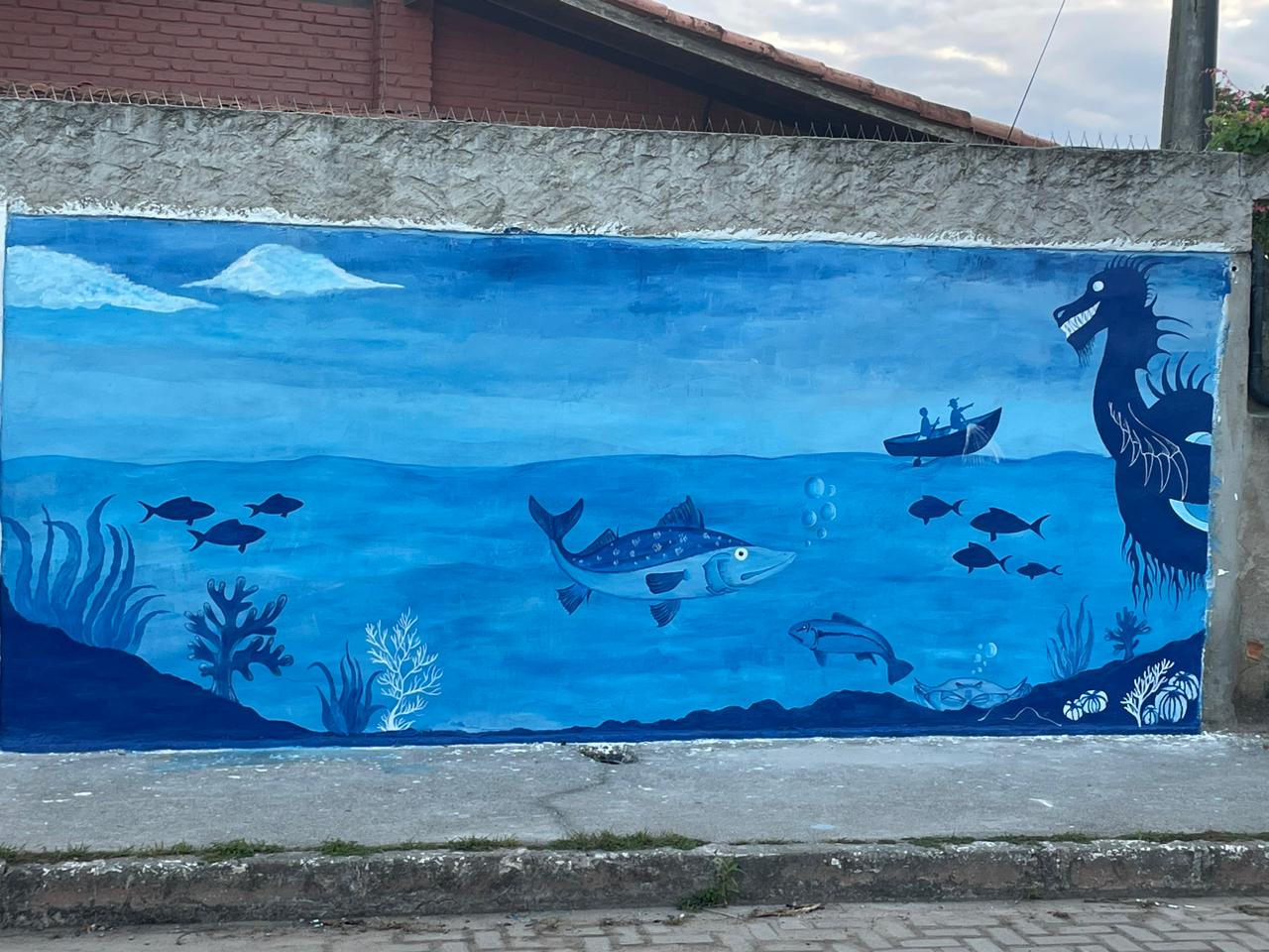 “O Mangue e o Monstro Marinho” é um mural de 5 metros de largura por 2 metros de altura, em tons de azul e branco, com cinco tipos de peixes do bioma manguezal. Na esquerda, em uma pedra, temos uma Maria Sapeba, peixe que é bem plano com os olhos bem juntinhos, um do lado do outro. No centro do mural, nas águas azuis escuras, tem um majestoso e grande robalo. Ao lado e abaixo, um pouco menor uma tainha. Ao fundo alguns peixinhos carapaus e do lado direito, quase que escondido, um siri-açú. Logo acima, à esquerda, navegando nas águas azuis escuras, um barquinho com dois pescadores segurando uma rede de pesca bem assustados com a figura gigantesca emergindo das águas, ao lado esquerdo, o lendário Monstro Marinho, com um olhar penetrante para os pescadores, dentes pontiagudos, garras afiadas, inúmeras escamas e com algas marinhas emaranhadas.